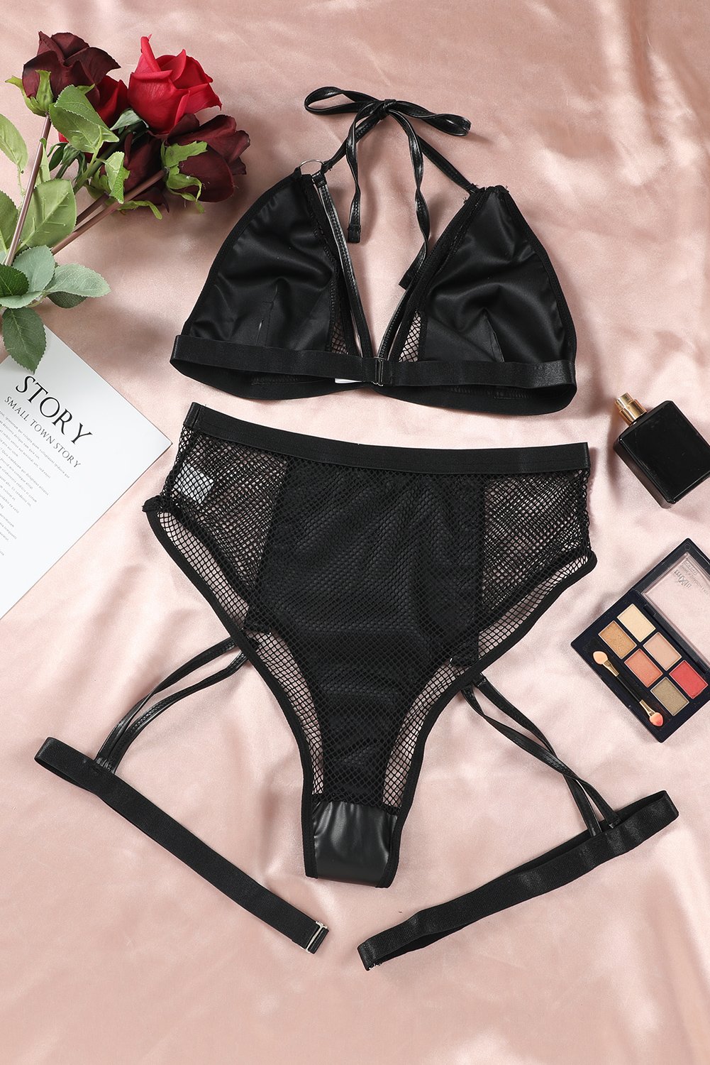 Black Faux Leather Mesh Halter Gater Bra Set quantity