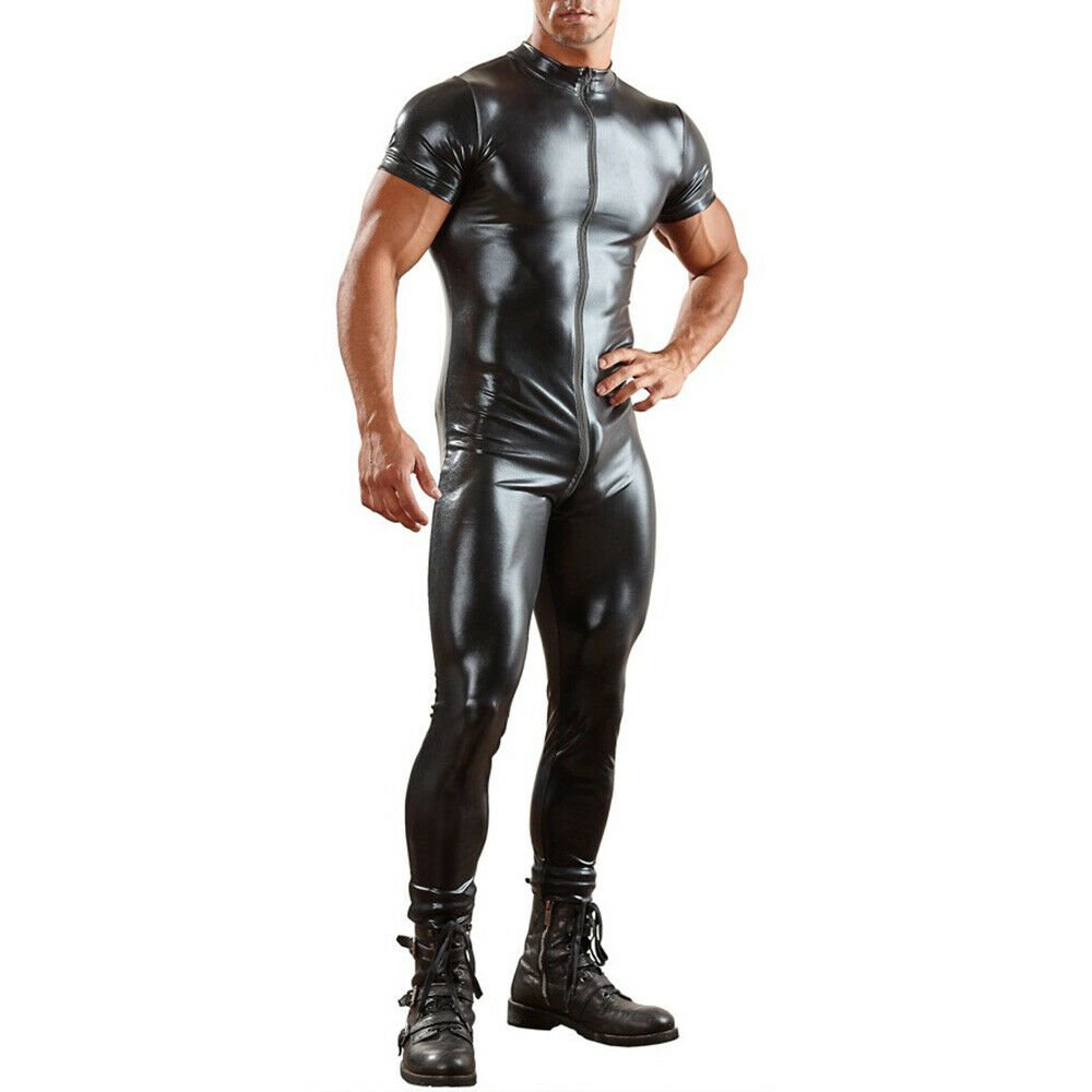 Sexy Mens Faux Leather Wet Look Zipper Catsuit Bodysuit