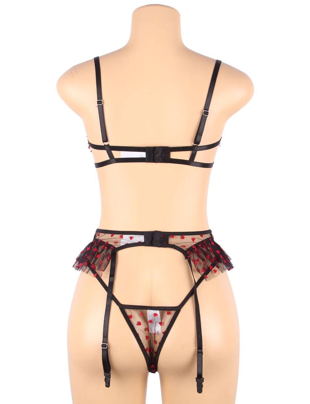 Mesh Hearts Ruffle Open Bust Suspender Bra Set quantity