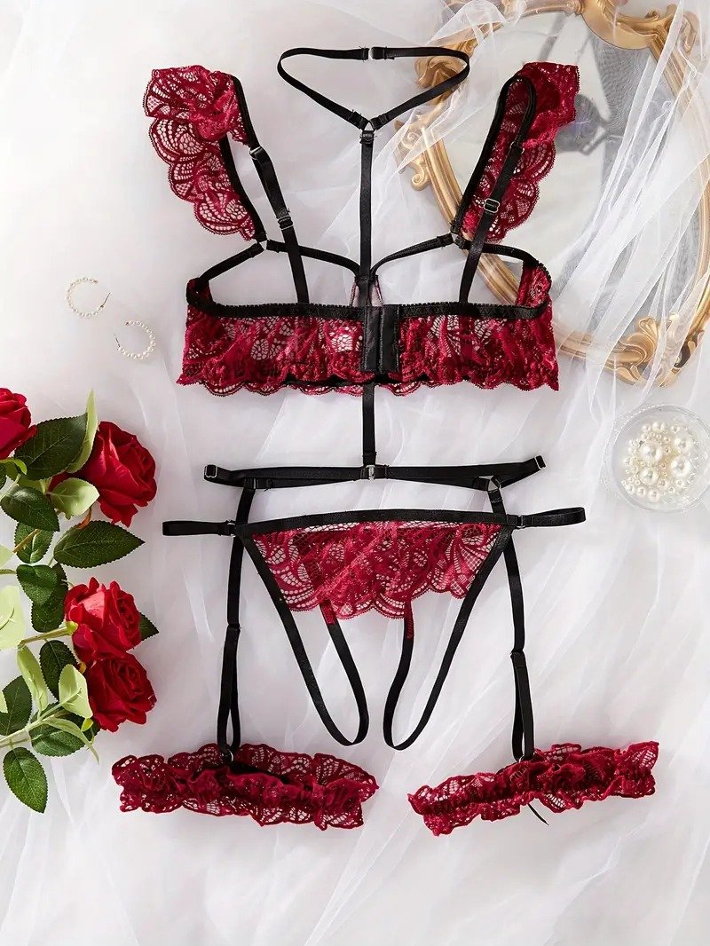 Sexy Red Lace Open Cup Choker Crotchless Suspender Bra Set
